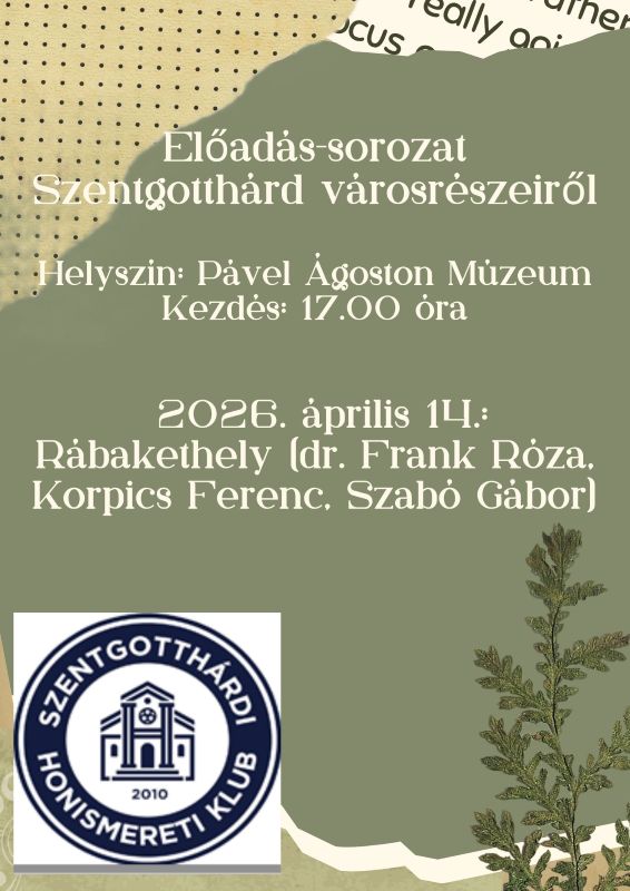 A Honismereti Klub szeretettel várja az érdeklődőket 2026. április 14-én 17 órára a Pável Ágoston Múzeumba a városrészi előadás-sorozat következő alkalmára, amelyen Rábakethely kerül a középpontba.