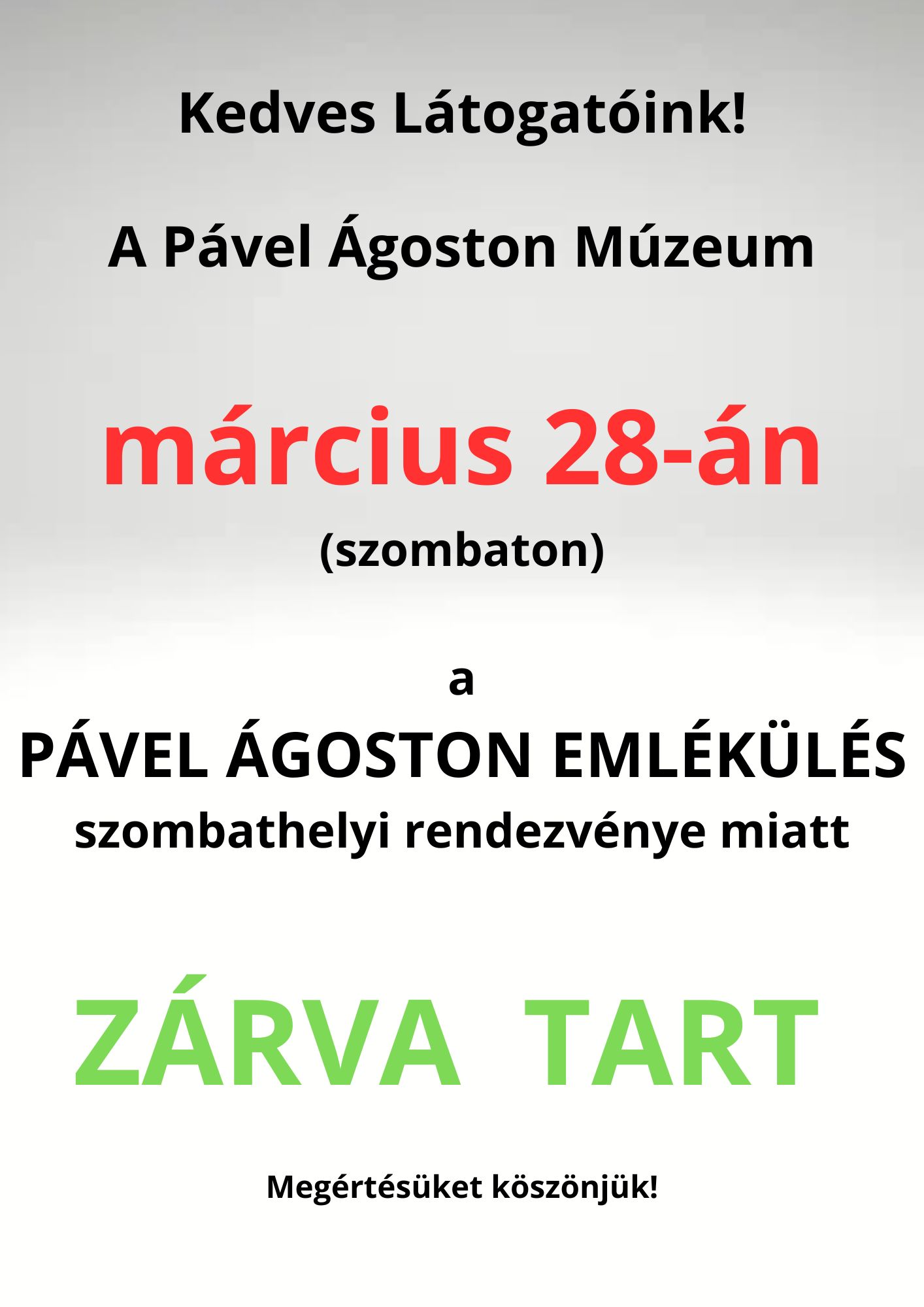A Pável Ágoston Múzeum 2026. március 28-án (szombaton) a Pável Ágoston emlékülés szombathelyi rendezvénye miatt zárva tart. Megértésüket köszönjük!