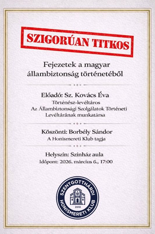 A Honismereti Klub szeretettel várja az érdeklődőket 2026. március 6-án 17 órára a Színház aulájába Sz. Kovács Éva előadására.